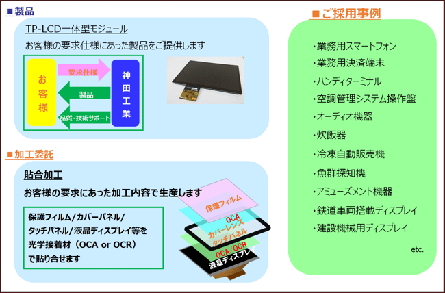 タッチパネル付LCD・カバーガラス付LCD液晶モジュールも取り扱っております。